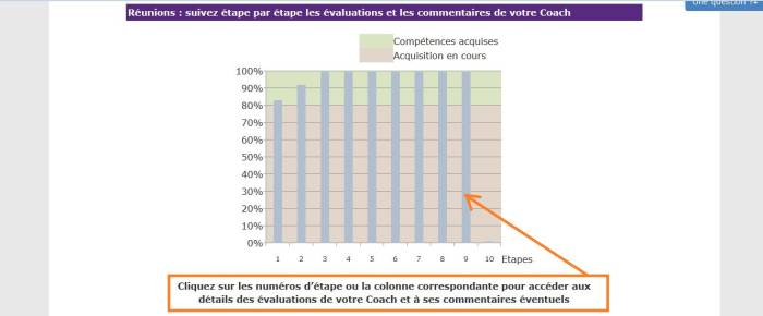 Sur cette page, un diagramme indique étape par étape votre niveau d’acquisition des compétences cibles. En cliquant sur l’une des colonnes, vous avez accès aux résultats et commentaires détaillés pour le module sélectionné.