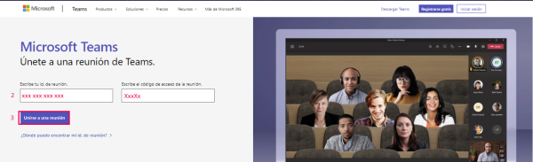 Si no puedes usar el link que se te ha proporcionado, por ejemplo, si estás uniéndote a la reunión desde otro dispositivo, puedes usar una de las siguientes opciones para unirte con el ID de la reunión & código de acceso.